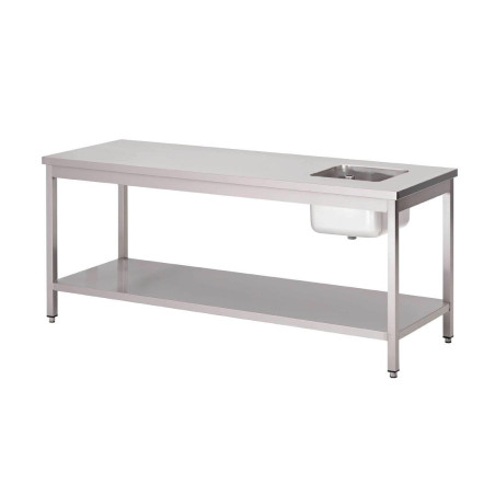 Idéale pour les professionnels de la restauration, cette Table Du Chef Inox Avec Bac À Gauche Et Étagère Basse en acier inoxydable est renforcée par un panneau de particules mélaminées de 18 mm caché par une tôle d'acier galvanisé collée et un plateau de 400x400x300 mm pour le rangement. La table mesure 1800mm de longueur, 700mm de profondeur et 850mm de hauteur. Les pieds sont réglables pour les sols irréguliers.